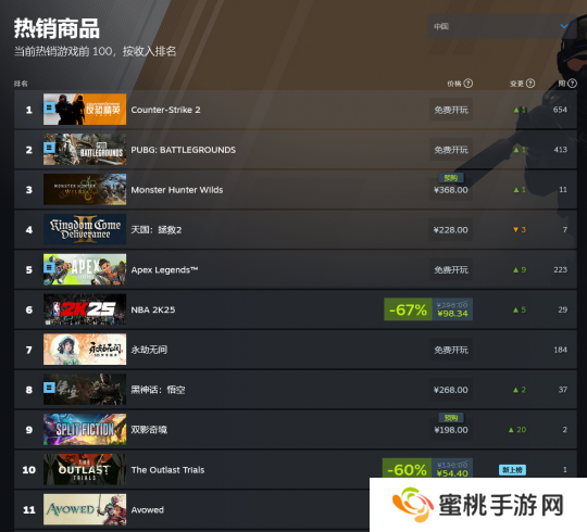 截至稿前,游戏依然在欧美多国位居榜首,不过在全球榜排名第三,落后于《CS2》以及《怪物猎人:荒野》的预购。在国区,游戏排名掉出了前十位,不及最近推出的《天国:拯救2》、《双人成行》开发商新作《双影奇境》以及近日促销的《逃生:试炼》。