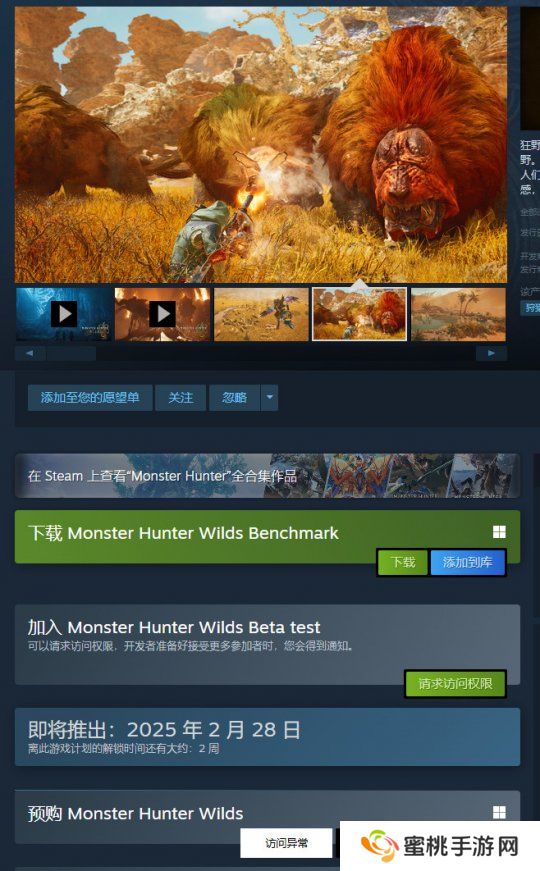 如果你想在Steam参加BETA公测,只需要在《怪物猎人:荒野》Steam商店页点击“请求访问权限”,便可进入,确保你的PC有24GB的硬盘空间。