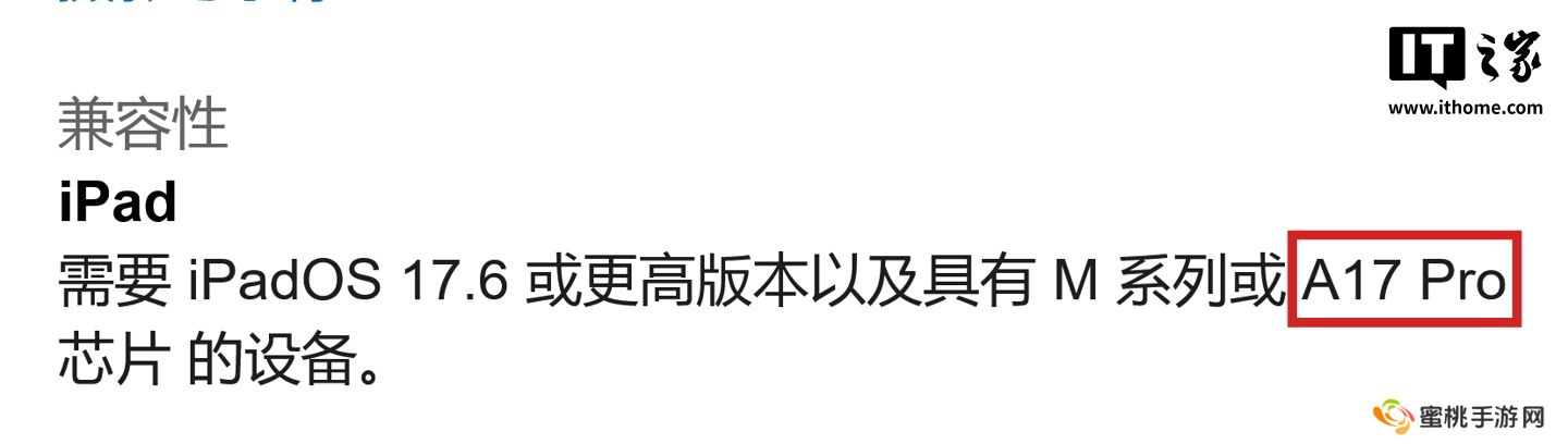 不过在中国 App Store 页面上,依然显示“需要 iPadOS 17.6 或更高版本以及具有 M 系列或 A17 Pro 芯片的设备”,可能是国内页面尚未跟进修改。